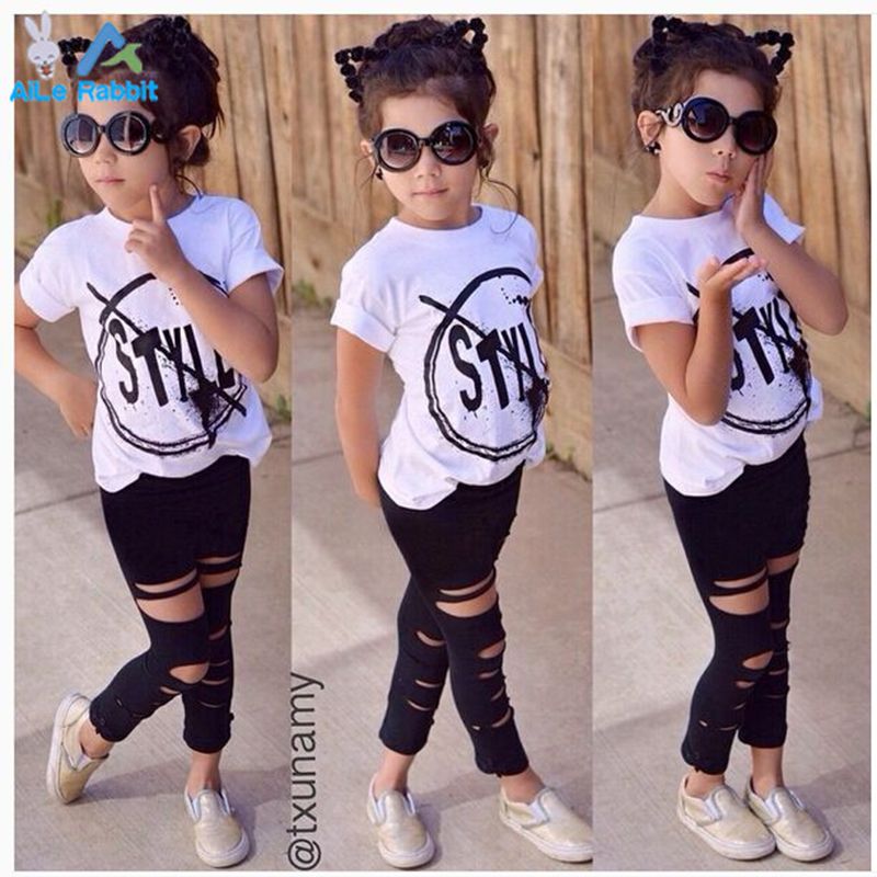 2019 Wholesale 2016 New Fashion Kids Girls Clothes Set Little Girl Summer Short Sleeve T Shirt And Hole Pant Leggings Outfit Children Set From